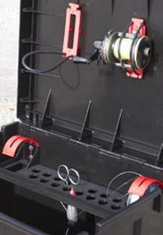 Keeps you tackle bits tidy and ready to use.includes a tray to hold 16 leads Leader line dispensers two multiplier reel holders and a camlock to prevent the box opening accidentally.