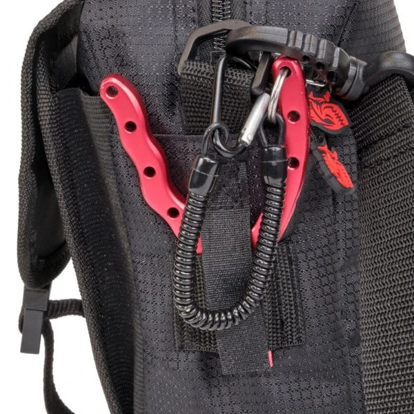 To one side is a tool loop with velcro fastening for scissors, pliers and other tools. To the other side is a material flap that is secured with velcro and clips to hold a landing net, drink and other round items.