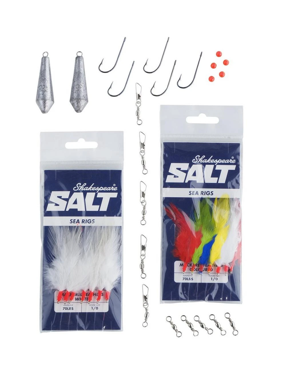 - Hardcase tacklebox included with: 1x surfcasting rig, 1x mackerel feathers, 2x 3oz sinker, 5x hooks, 5x beads, 5x swivels and 5x link swivels